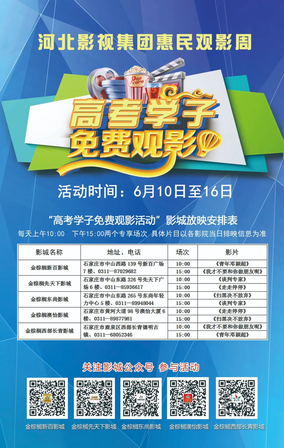 此次活动从6月10日持续至6月16日,期间广大高考学子只需凭准考证,通过关注河北影视集团旗下参与活动影城的公众号或到影城前台报名,就可参与免费观影。