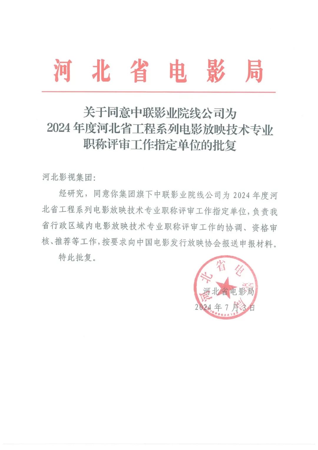 附件2:河北省电影局《关于同意中联影业院线公司为2024年度河北省工程系列电影放映技术专业职称评审工作指定单位的批复》