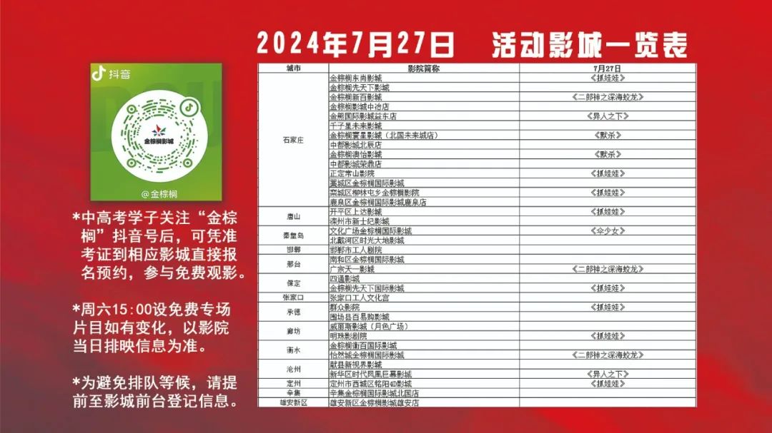 中高考学子免费观影活动是中共河北省委宣传部、河北省电影局主办的“庆祝中华人民共和国成立75周年”电影主题展映活动的一项重要活动内容,自6月10日开展以来,持续开展至8月底。7月27日,即本周六将在16家影院排映免费观影专享场次,欢迎广大中高考毕业生报名参与。