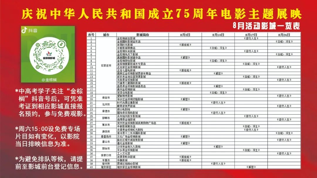 8月,活动将在河北影视集团中联院线旗下40家影城开展,每周六下午15:00在不同影城开设免费电影专享场次,重点放映《抓娃娃》《解密》《逆行人生》《白蛇:浮生》等热门影片,欢迎广大学子积极参与。