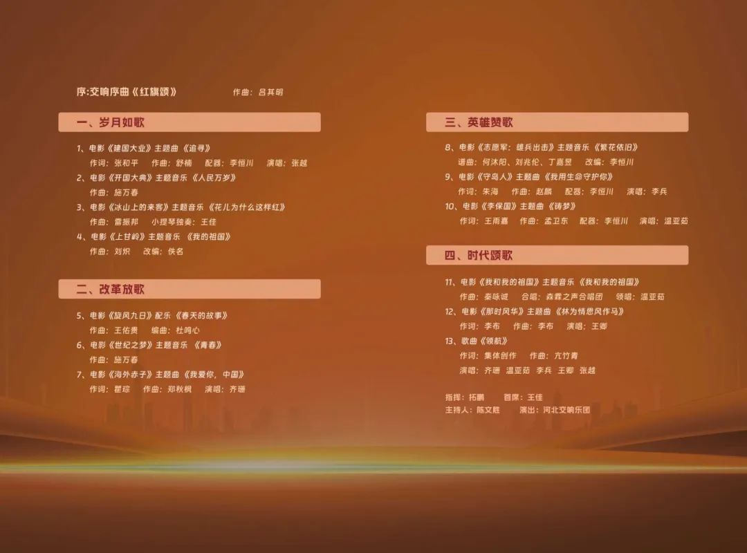 音乐会由河北影视集团承办,河北影视集团中联院线、河北交响乐团联合执行。音乐会以交响序曲《红旗颂》开场,分成“岁月如歌”“改革放歌”“英雄赞歌”“时代颂歌”四个篇章,将演奏13首新中国成立75年来各个历史时期具有代表性的电影作品音乐,在光影与音乐之中重温经典,感悟新中国的伟大成就,奏响阔步新征程的时代乐章!