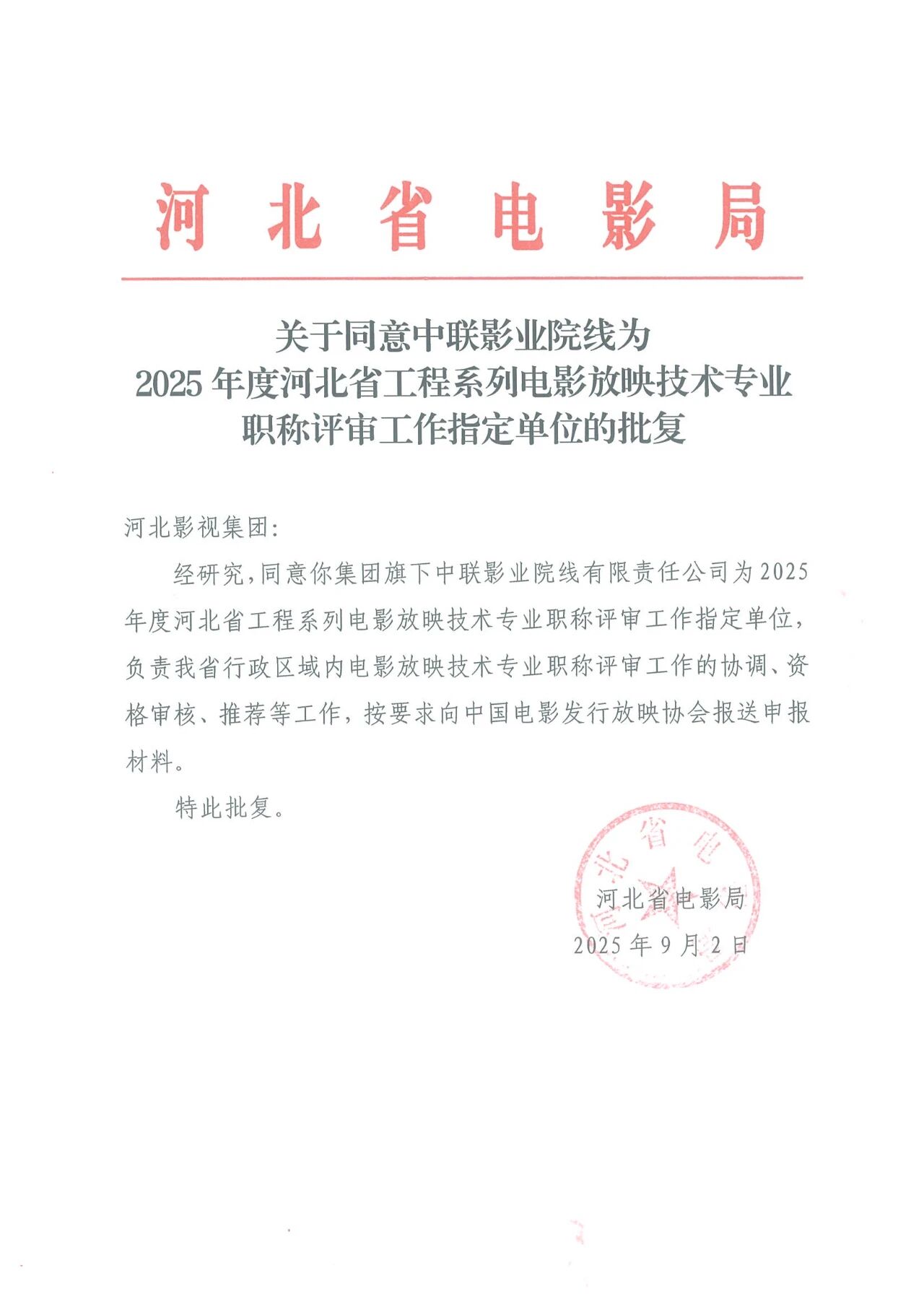 附件2:河北省电影局《关于同意中联影业院线为2025年度河北省工程系列电影放映技术专业职称评审工作指定单位的批复》